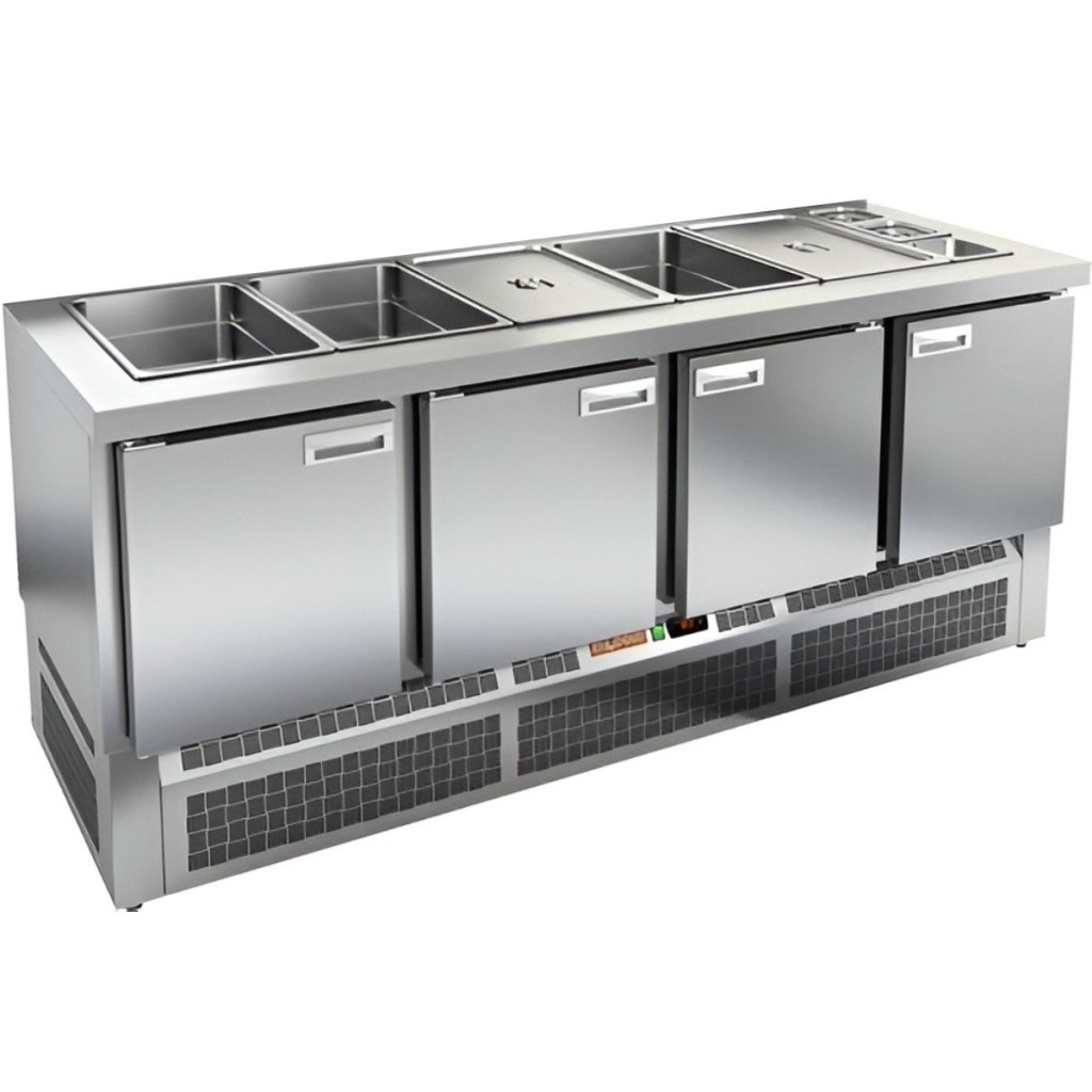 Модель обеспечивает удобный доступ к продуктам и позволяет повару работать максимально эффективно. Корпус и столешница изготовлены из нержавеющей стали, что гарантирует долговечность конструкции, устойчивость к коррозии и соответствие санитарным нормам.