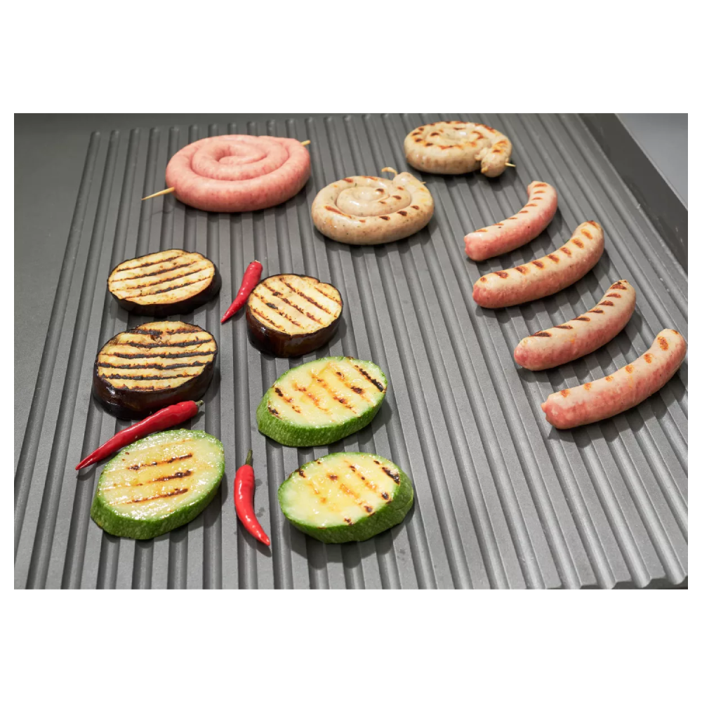 Рабочая зона — рифлёная, идеальна для жарки стейков из мяса и рыбы, а так же овощей-гриль. Конструкция устройства предусматривает открытую подставку с полкой для хранения, выполненную из прочного окрашенного металла.